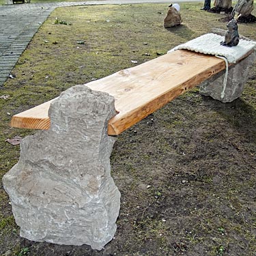 Im Kellerwald gibt es nicht nur viele Bäume, sondern auch sehr schöne Steine. Hartmut Reiser bemüht sich immer wieder, zwei zueinander passende Steine zu finden, die er mit dem richtigen Brett in eine praktische und elegante Sitzbank verwandelt.
