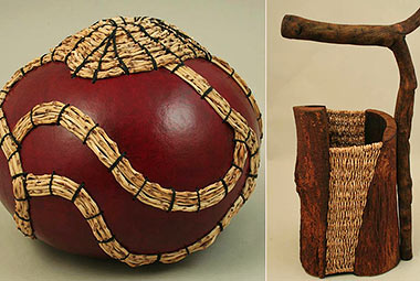 "The primary focus of my work is the creation of form utilizing natural fibers." Don Weeke nutzt unterschiedliche Materialien und traditionelle Techniken der Korbflechterei, um seine intuitiven Vorstellungen von einer bestimmten Form in die Realität umzusetzen. Dabei verwendet er natürlich Materialien wie Kürbisse, Eichenzweige, Eukalyptus-Rinde und Palmwedel, die er teilweise mit Acrylfarben bemalt.